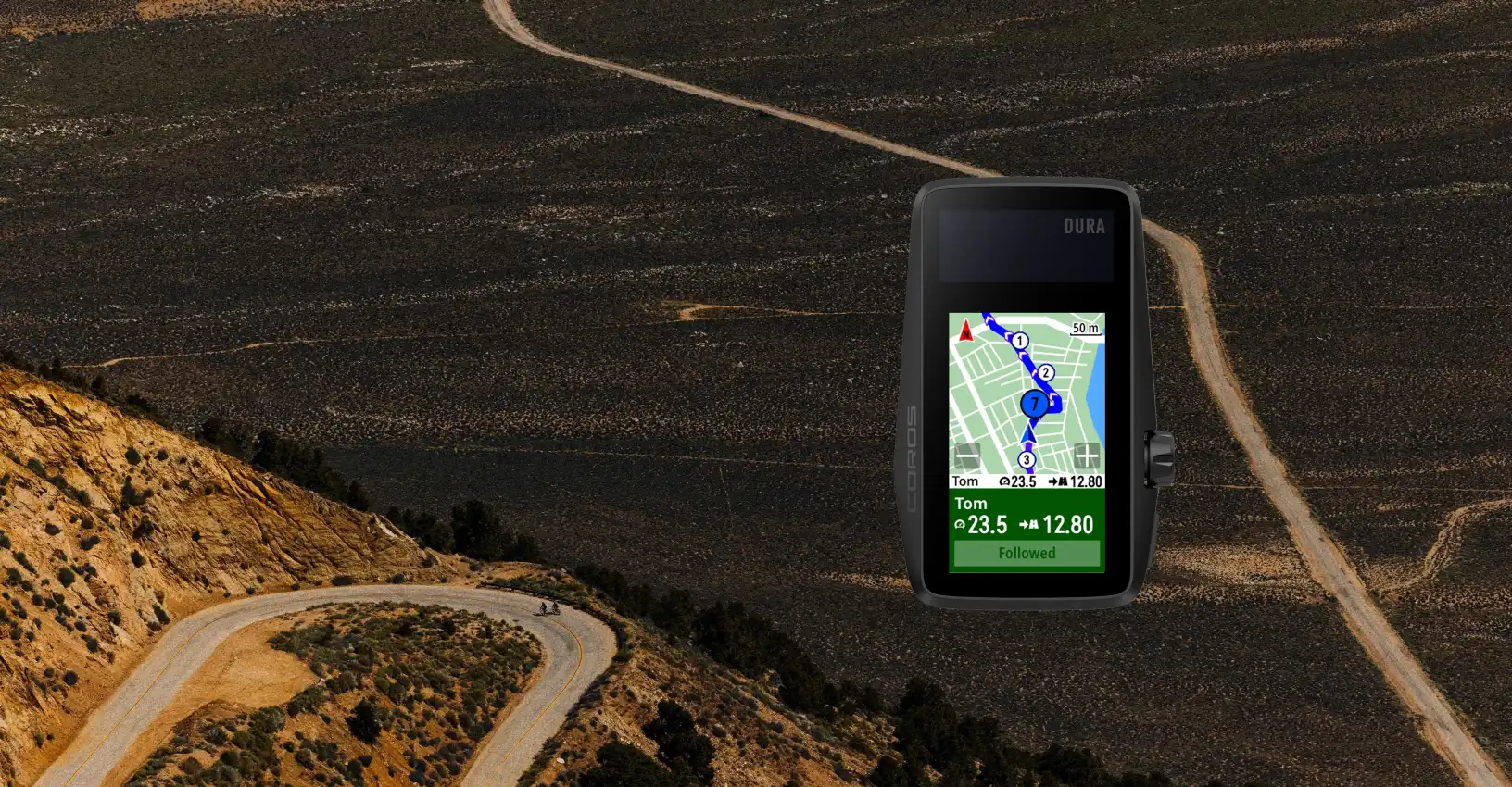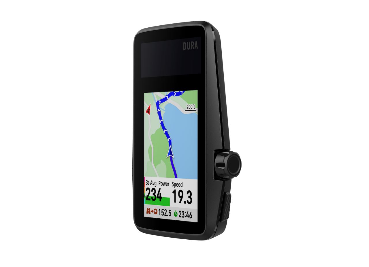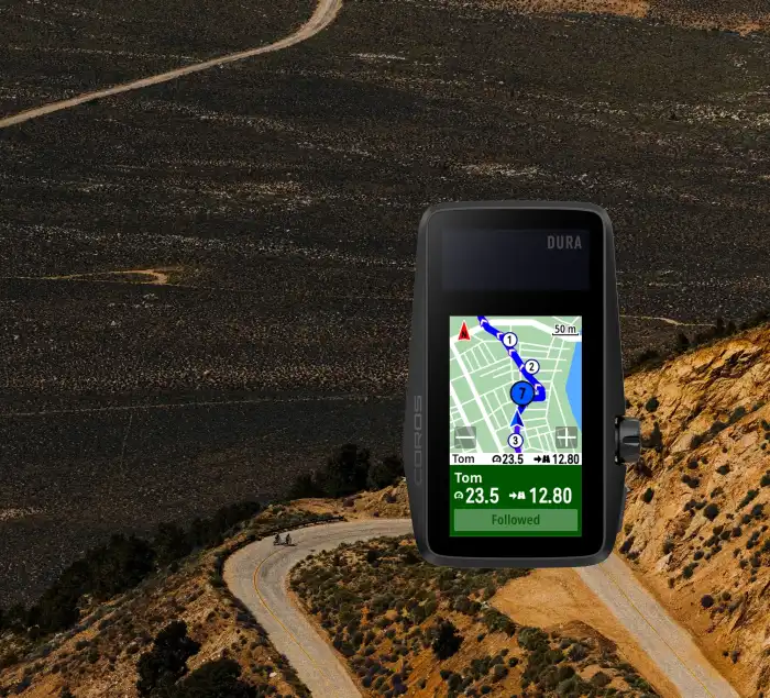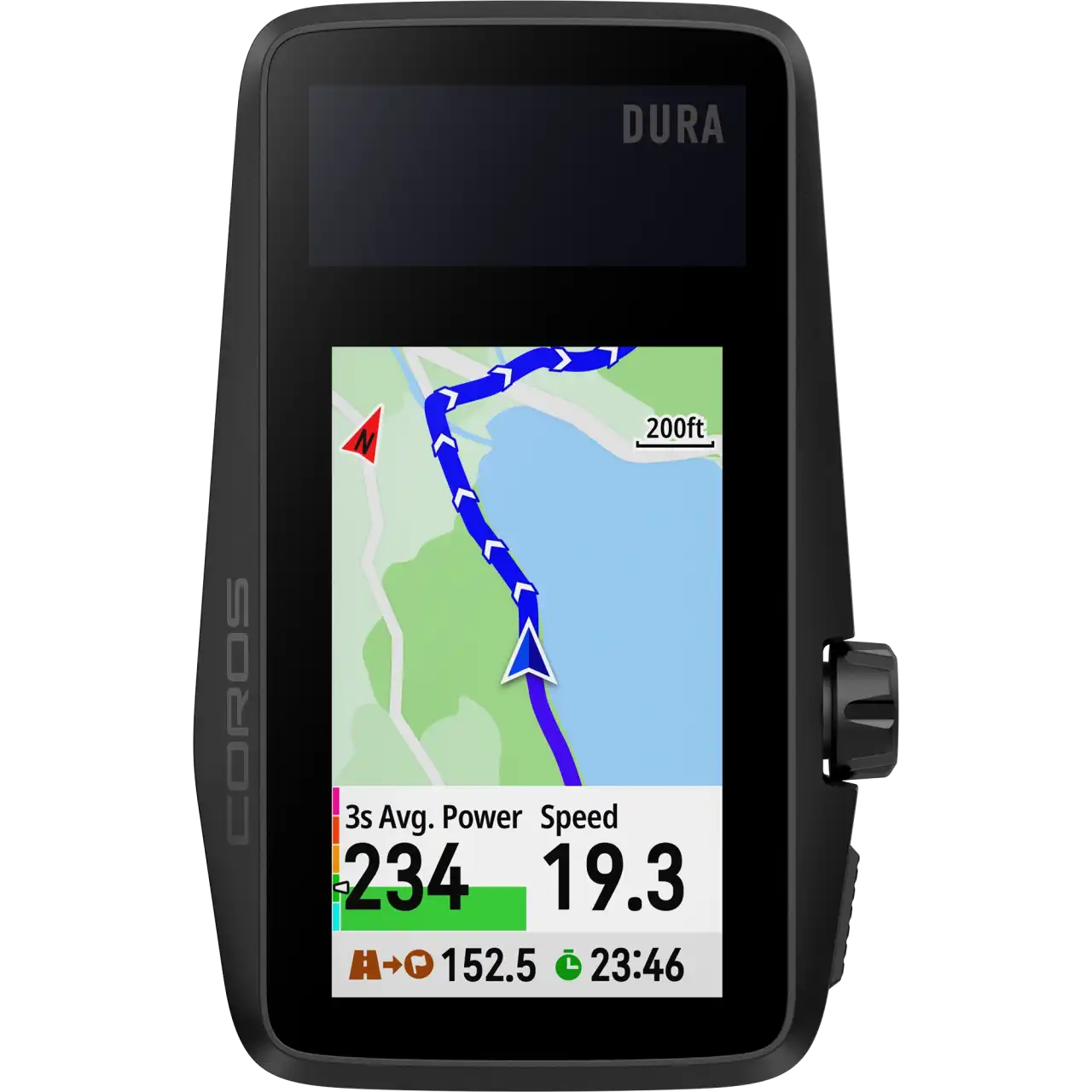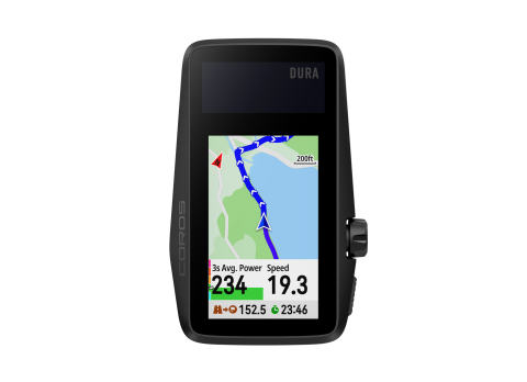 A DURA beépített globális offline térképekkel érkezik, fordulóról fordulóra navigációval és (Climb funkcióval) emelkedő-előrejelzéssel. Komoot, Strava és Ride with GPS integrációval az útvonaltervezés kényelmes. Fontos tudni azonban: az offline térképek nem tartalmaznak utcaneveket vagy POI-kat, és az újratervezés csak mobilneten keresztül, a telefon appján át működik. Mobilhálózat lefedettség nélkül ez hátrány.