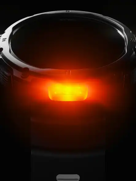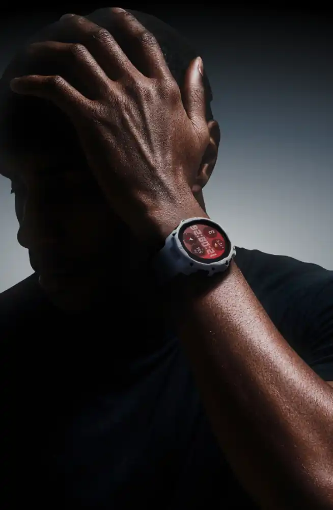 Reinforced polymer body with an 8-screw chassis — absorbs impacts to protect the watch and its sensors.